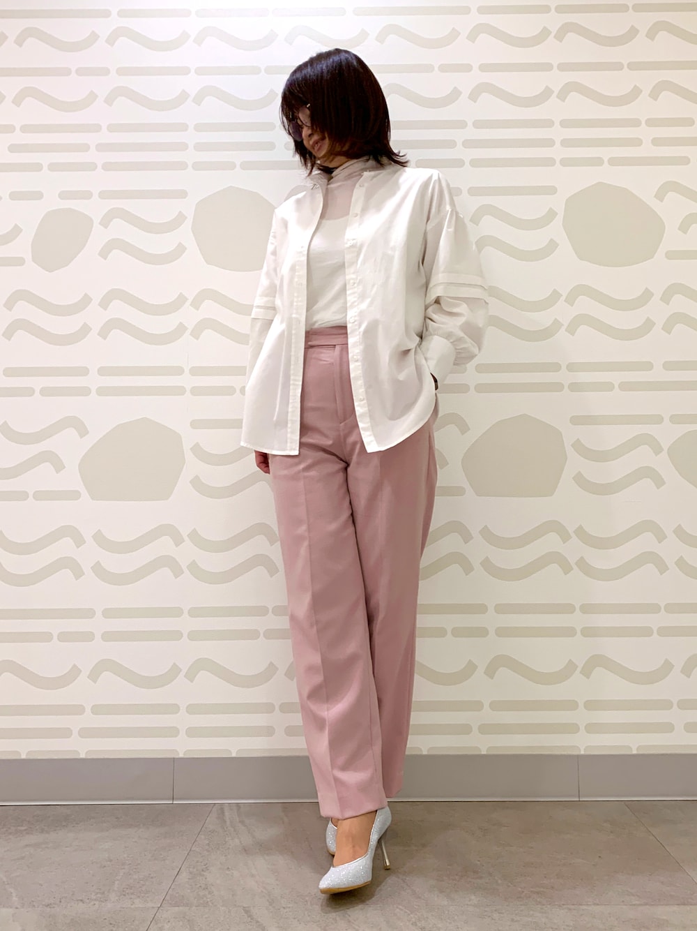 いつもご覧いただきありがとうございます✨ シンプルなシャツにカラーパンツが映えるコーデです🌷 キラキラしたシルバーのパンプスがシンプルなコーデに華やかさをプラスしてくれます⭐︎