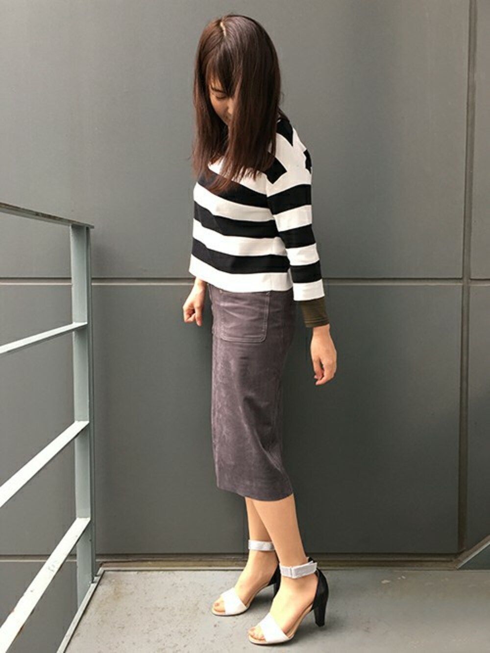モノトーンでコーディネートしました。 太ベルト、太ヒールのサンダルなのに華奢で大人っぽい雰囲気になるので、あえてカジュアルに合わせてみました。 太めヒールなのでヒールのわりに安定感のある履き心地です。
