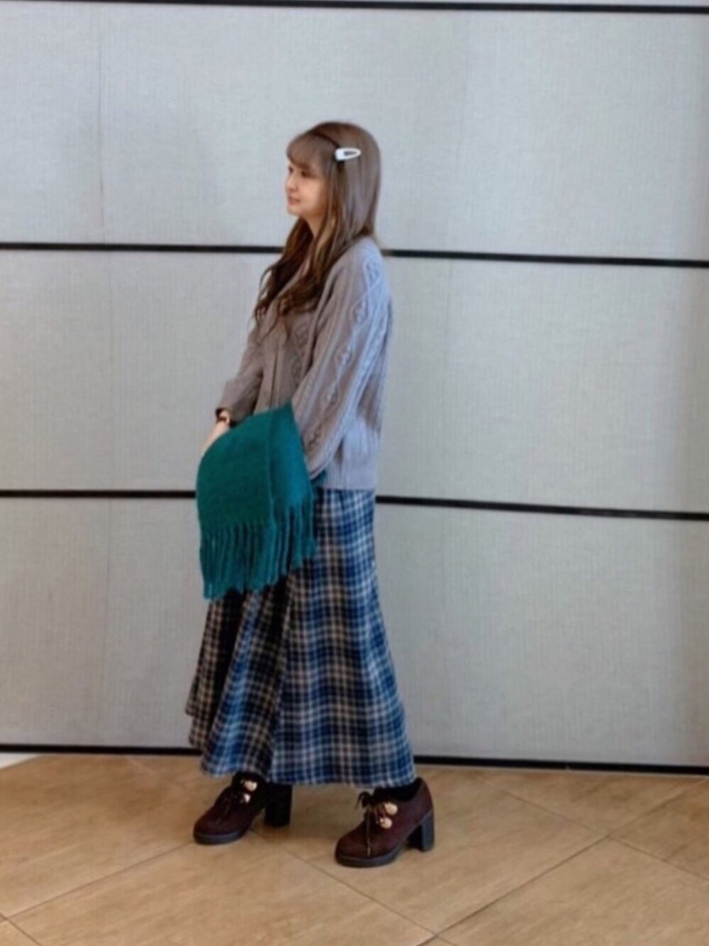 カラバリ豊富なカーディガン💗 グレーにしてみた🥴 グリーンが可愛いストールは防寒対策ね❤️😁 ご覧いただきありがとうございます😍