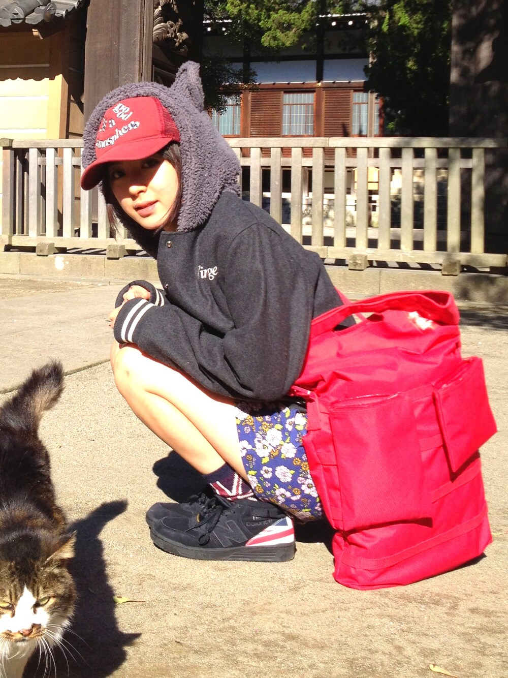 ニューバランスの、ユニオンジャック柄のスニーカーがお気に入りです。スタジャンのフードには耳が付いてます。