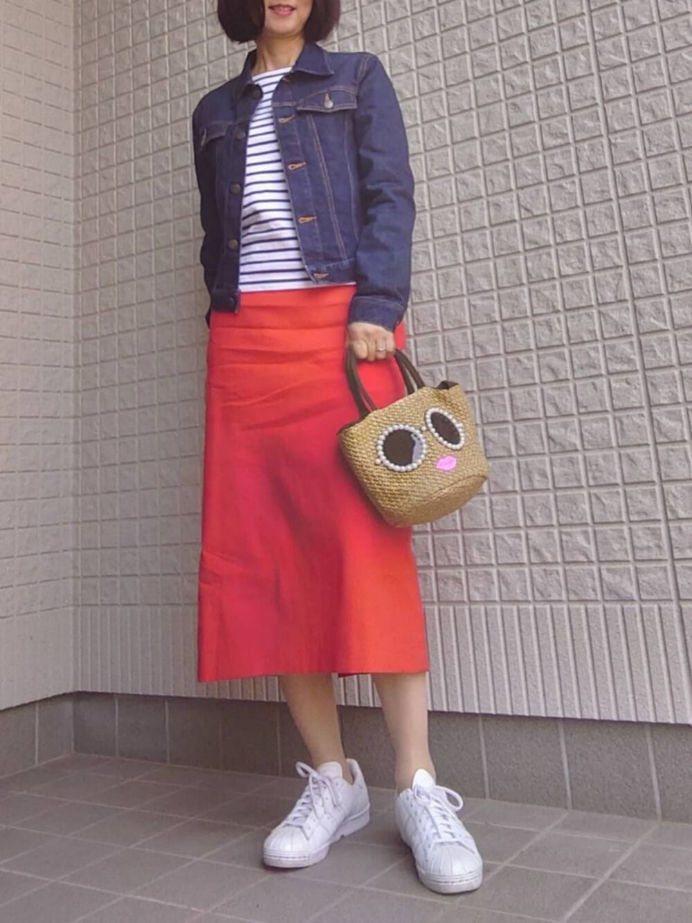 定番ボーダーとデニムジャケットにトマトレッドのロングタイトスカートを合わせてトリコロールカラーにまとめました😊