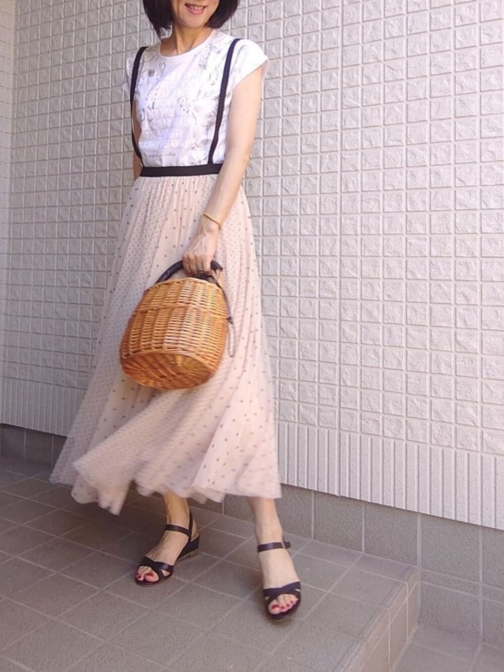 たくさんの中からご覧頂き嬉しいです😊 いつもいいね、お気に入り、フォルダーインもありがとうございます❤️ サスペンダー付きのドット柄チュールスカートが珍しくて一目惚れ😍 銀箔プリントTシャツと合わせてカジュアルダウンしたきれいめコーデにしてみました😊 Instagram @hinahime4355 よろしくお願いします😉