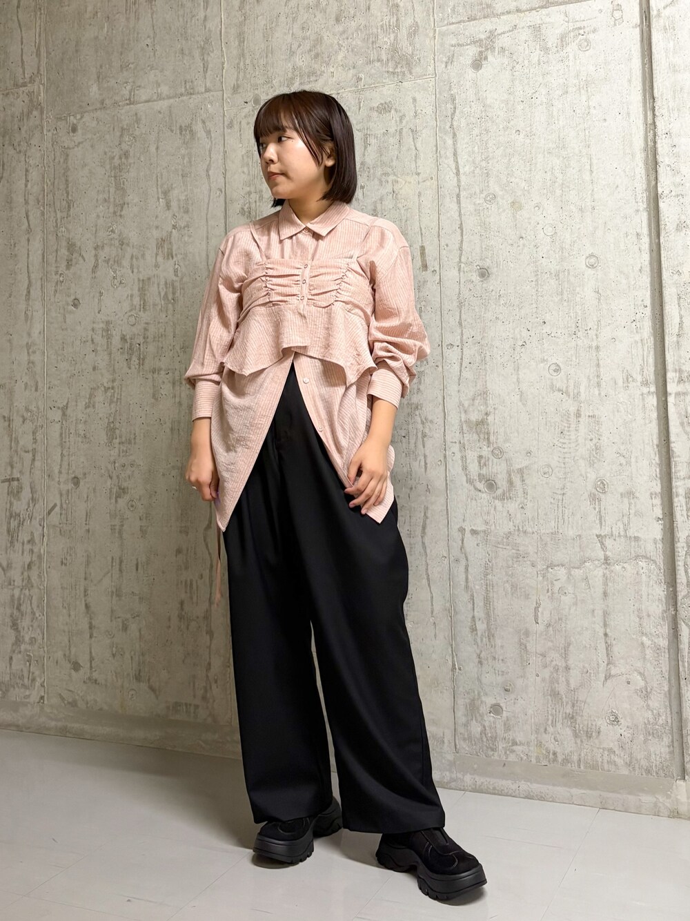今から着れる秋コーデを着てみました! シャツは生地感がさらっとしていて、前のボタンを開けても綺麗に見せてくれます! 甘すぎないくすみピンクもかわいくて◎ スラックスはすごく軽くて履き心地がいいですよ。 ももまわりにタックでゆとりがあるのも嬉しいなと思いました! スリッポンも厚底デザインですが、軽かったのでたくさん歩く日にも◎