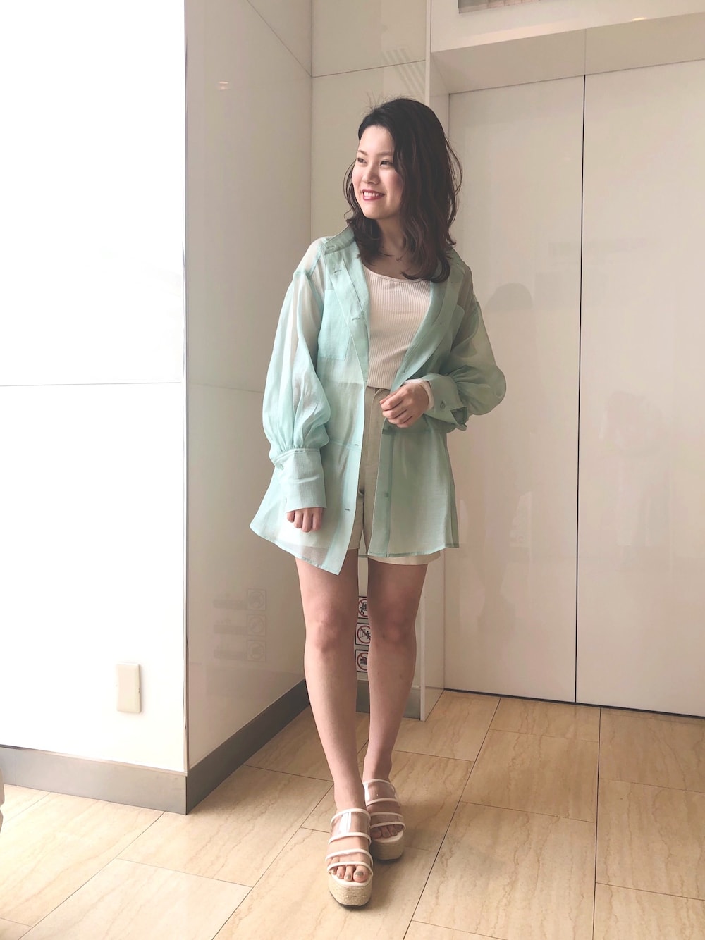 鮮やかなグリーンのシャツをさらっと羽織った大人甘カジュコーデ♫ 脚を出すのが苦手でも足元にヒールを持ってきたので足長効果で履くことができました!