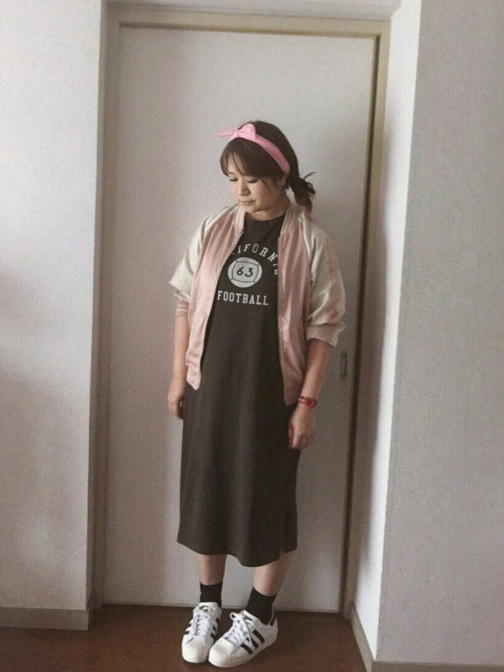 楽チンcode すみ黒の、半袖スウェットワンピにスカジャン合わせ。 黒じゃないので、淡い色が合わせやすいかなと思ってピンクスカジャン 袖はギュッと上げてバランスとってます。 ありがとうございました