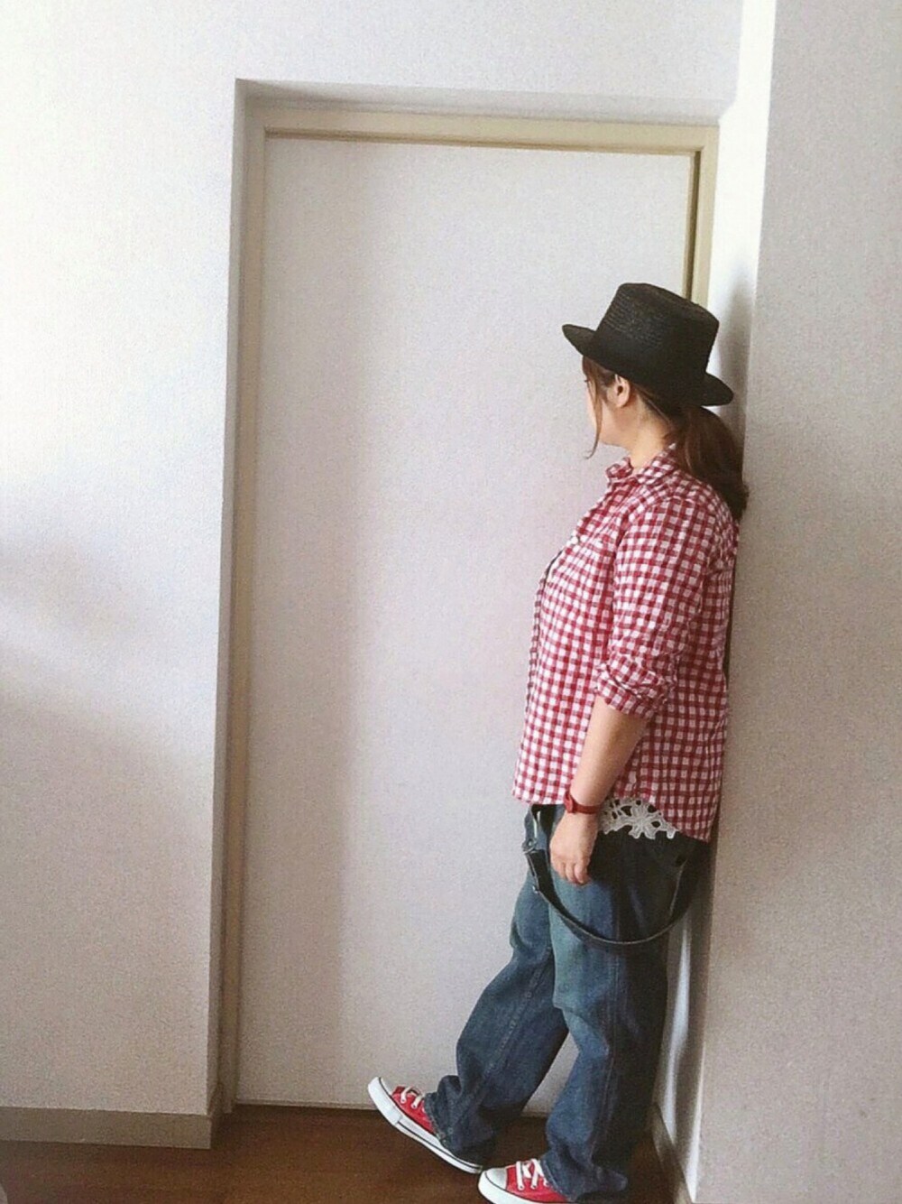 チェックのワッフル生地のシャツに、裾がレ-スのキャミをレイヤードしてます。 サロペットを、下ろしてユルリ。こうゆう格好が楽チン 黒のカンカン帽 ありがとうございました✨
