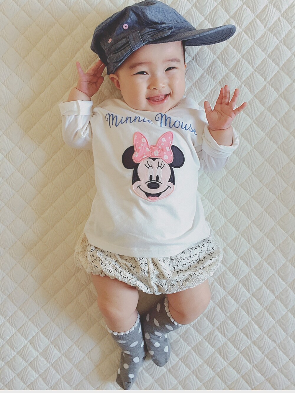 笑っちゃうくらい良いポーズを決めてくれた0歳児🤣 ユニクロのシャツはミッキーと迷ったけど、知り合いに男の子の様な格好ばかりさせていると指摘されたので😅ミニーをチョイス●🎀●