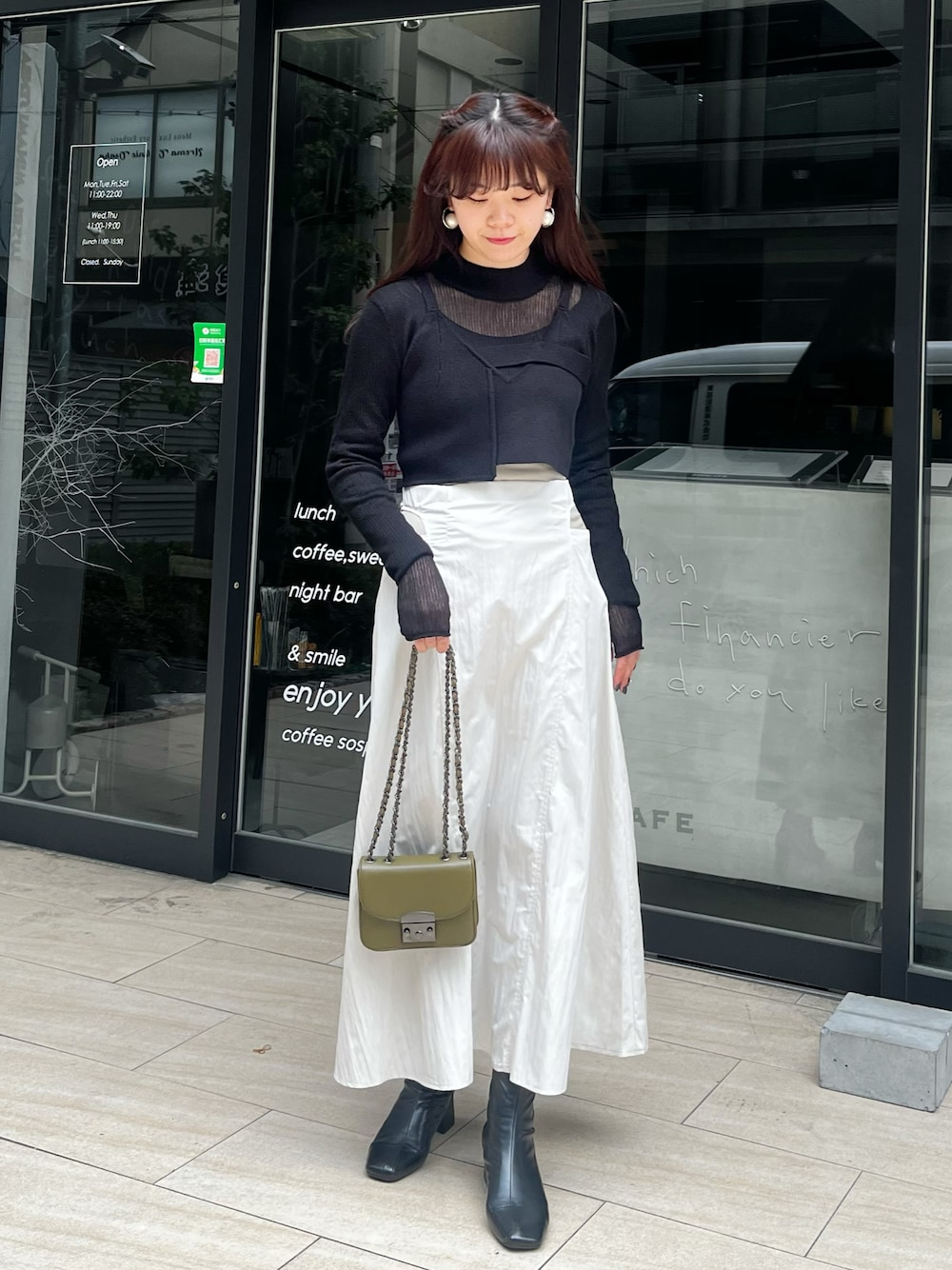 まだ少し早いですがシアーニットとナイロン素材のスカートを使って春コーデしてみました◎ スカートを2枚履いてるようなレイヤードスカートはメインの生地がナイロン素材なので、年中を通して着用していただけるアイテムです。 締めつけも少ないフレアスカートなので、気軽に着ていただけますよ👌🏻 今回はシアーニットにビスチェとモード系で合わせたけど、パーカーと合わせてカジュアル×モードも可愛いと思います! (2色展開でグレイッシュベージュとブラックがあります) 是非これからの時期のコーデの参考にしてみてください!