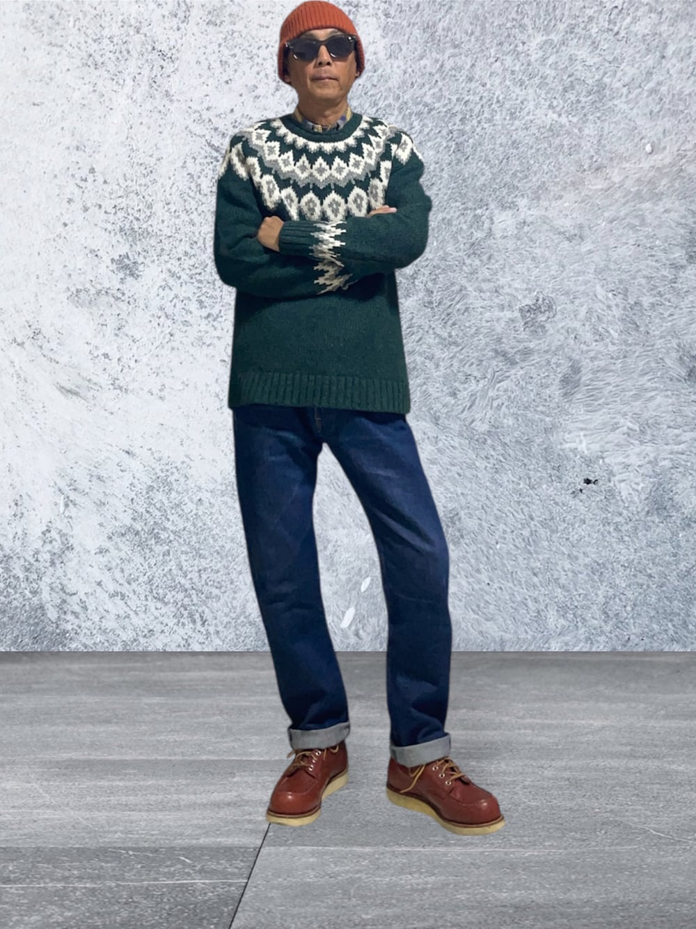 いつもたくさんのリアクションありがとうございます♪ 深いグリーンとノルディック柄が冬らしく、温かみのあるコーデ🙌 デニムのロールアップでブーツとのバランスを考え、スッキリとしたスタイルにしてみました👖🥾 まぁ〜『シェフの気まぐれサラダ』って感じのコーデです🥗✌️⇦ごっつネタをまだ引っ張る🤣