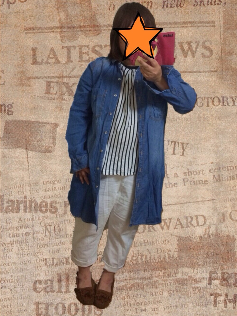 これまた、だいぶ前のコーデ。 職場のお食事会だったので、昨日アップしたFRAPBOISのシャツの襟を取って大人しめに。 白のパンツとデニムワンピを羽織にしてみました!