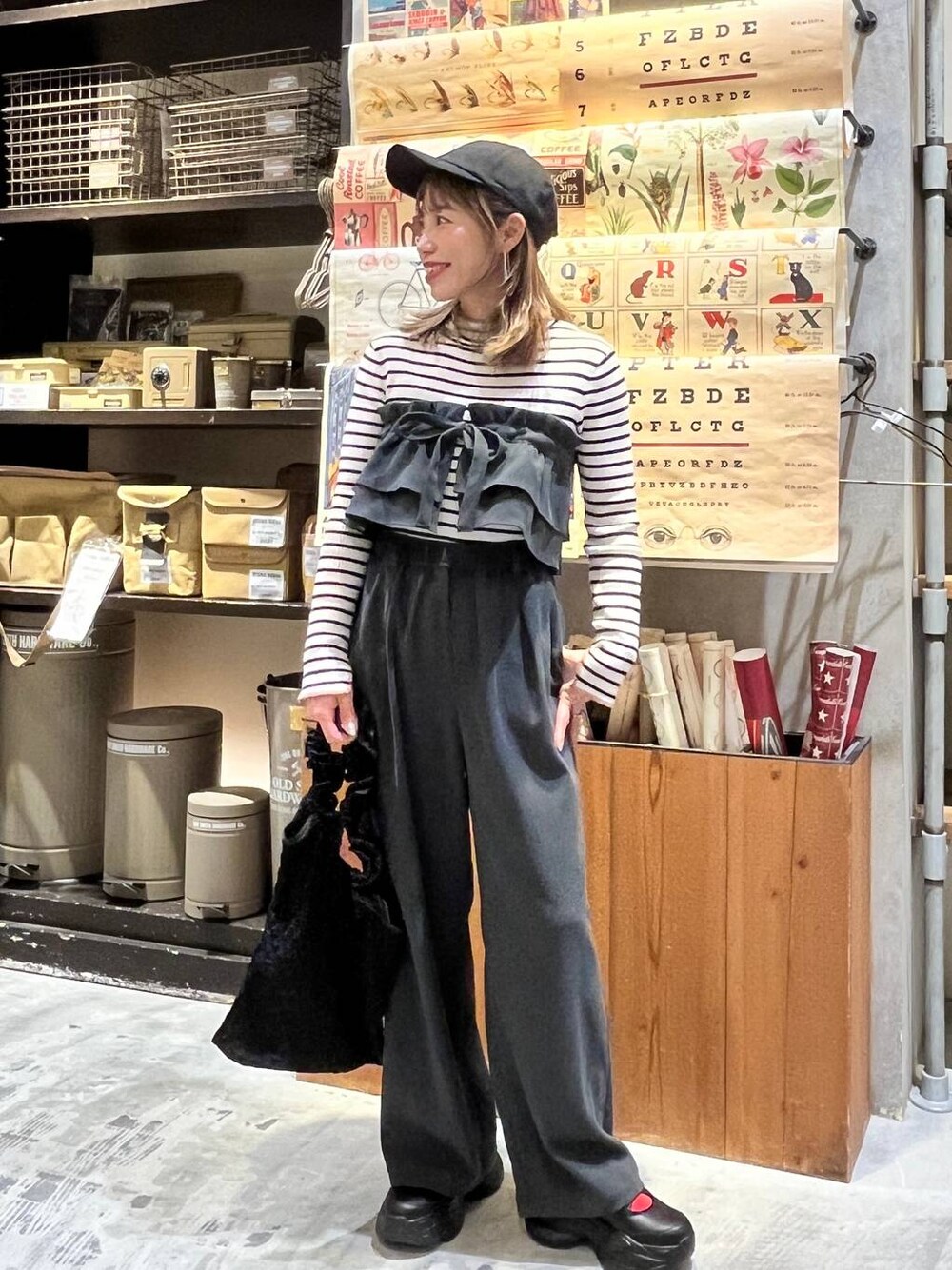 いつかの出勤コーデ☺︎ フリルベルトをビスチェ風に♡ パンツをハイウエストに履いてセットアップ風に着るのがお気に入り!! ぜひお試しください☺︎