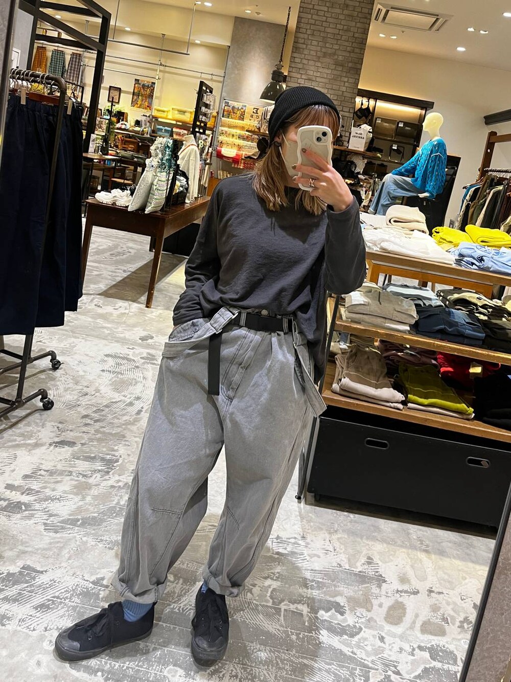 メンズライクワントーンコーデ☺︎ パンツはベルトで締めて肩紐を垂らしてちょっと違う着方を楽しんでみました♡ ベルトループがあるからこれもアリ♡ 裾も捲ってソックスでカラーを♡ ぜひお試しください☺︎