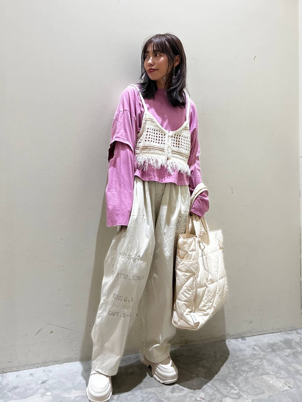 フリンジビスチェコーデ☺︎ ロンTにミリタリーパンツのカジュアルスタイルにフリンジのビスチェでアクセント♡ 一気に格上げおしゃれなコーデになります♡ オススメビスチェ、どんなスタイルにもマッチしちゃう! バランス悪く見えがちっていう方はぜひ投入してみてください♡ 落書きパンツはカラーで雰囲気全然違う!! どれも欲しくなっちゃう♡ イチオシはアイボリー!ステンシルがミリタリーテイストでかっこいい♡ ぜひお試しください☺︎