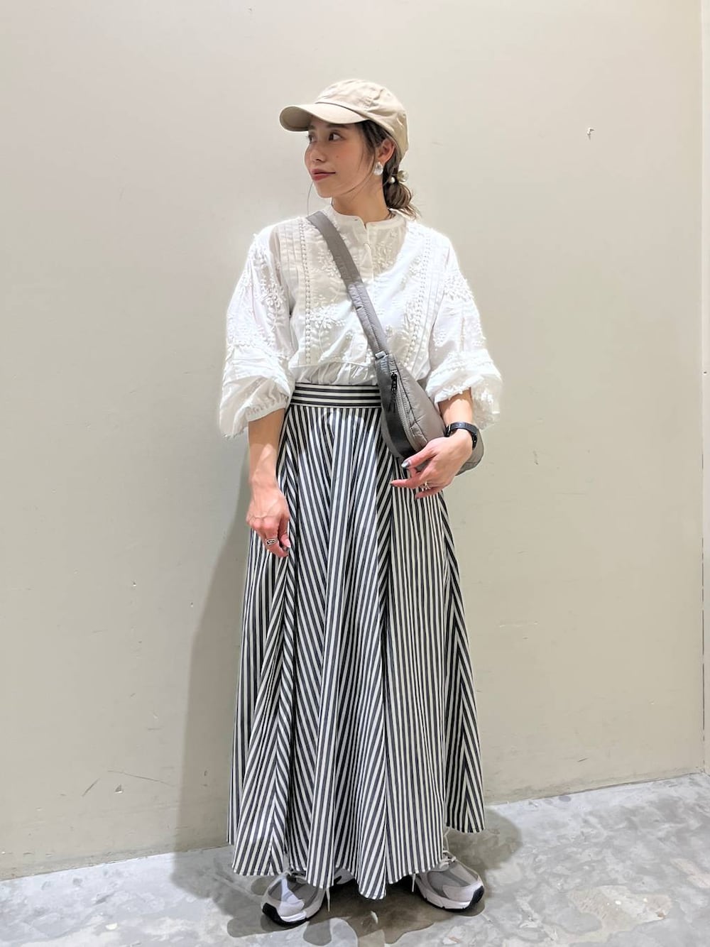 春の大人ガーリーコーデ☺︎ 立体感のある刺繍が可愛すぎる春にぴったりのブラウス♡ フレアスカート合わせでガーリーに♡ ストライプ柄がガーリーすぎなくて爽やか♡ ガーリーな装いの時は小物はカジュアルに♡ ぜひお試しください☺︎