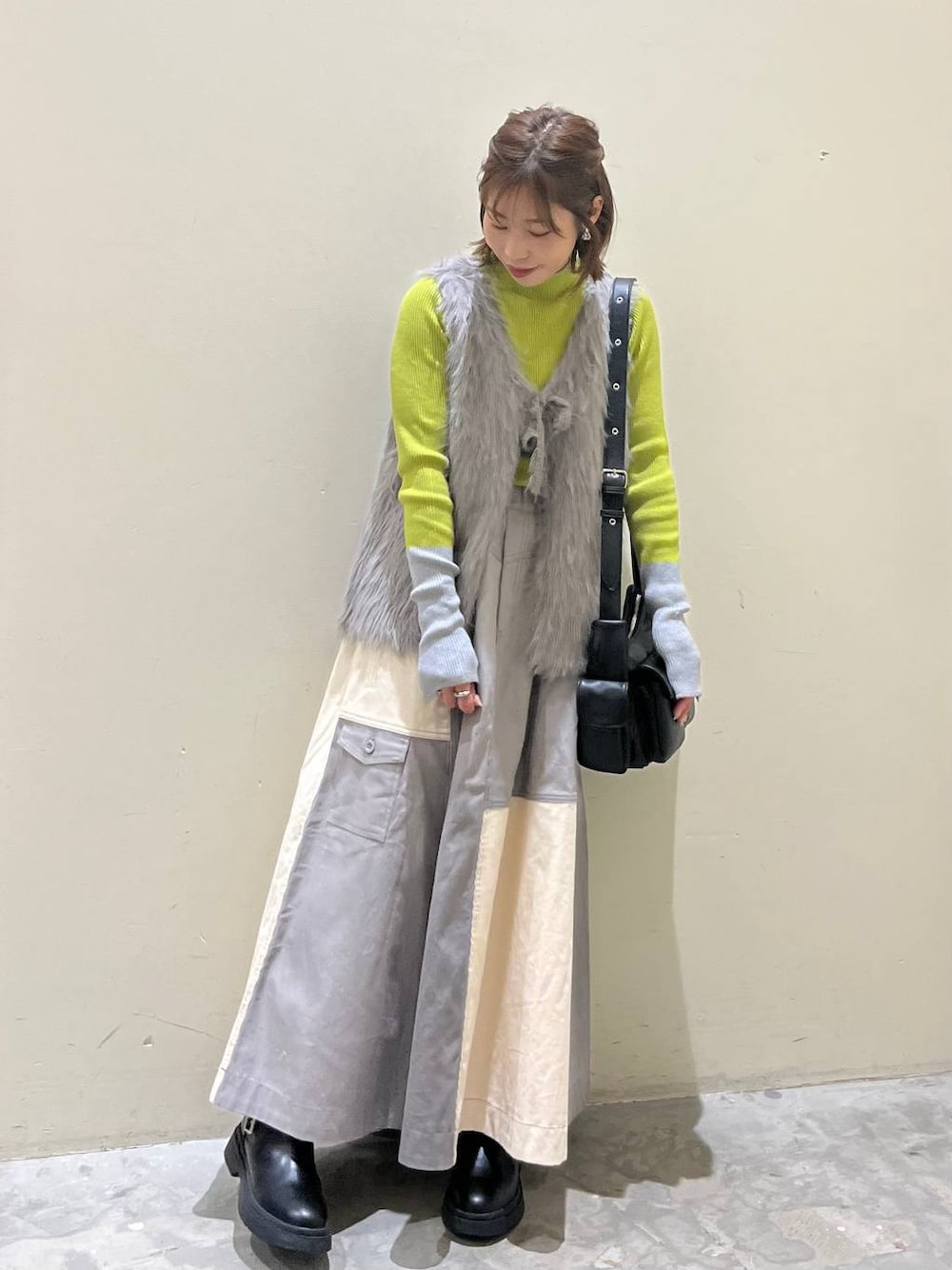 グレーコーデ☺︎ 袖の配色が可愛いニット、少し体のラインを拾うニットはベスト合わせがオススメ! ふわふわベストは重ねるだけで体型カバーもできておしゃれになるから便利! ぜひお試しください☺︎