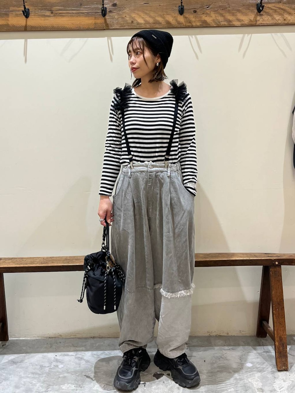 バルーンパンツコーデ☺︎ 体型拾わずゆるっと履けるパンツはデザイン性もさることながら、生地が柔らかくて履き心地抜群!! リメイク風デザインが見る人を惹きつける♡ 優しいグレーが春にぴったりです! ぜひお試しください☺︎