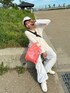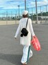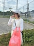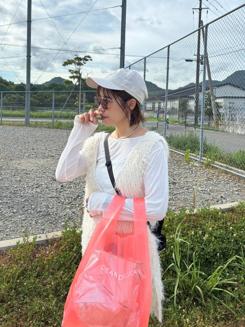 息子の試合観戦コーデ☺︎ ホワイトコーデにしたよ♡ コーラルオレンジのショッピングバッグが映える♡ LEPSIMのベストで体型カバー♡ ぜひお試しください☺︎