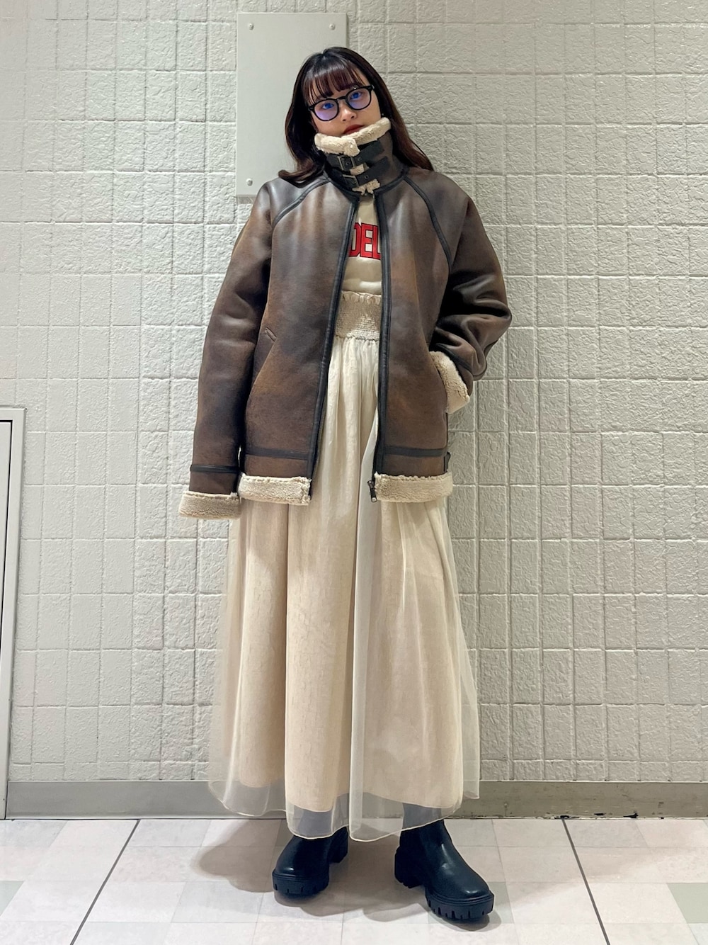 Hina(KBF ルミネエスト新宿)のムートンコート「フェイクムートンフライトジャケット」を使ったコーディネート