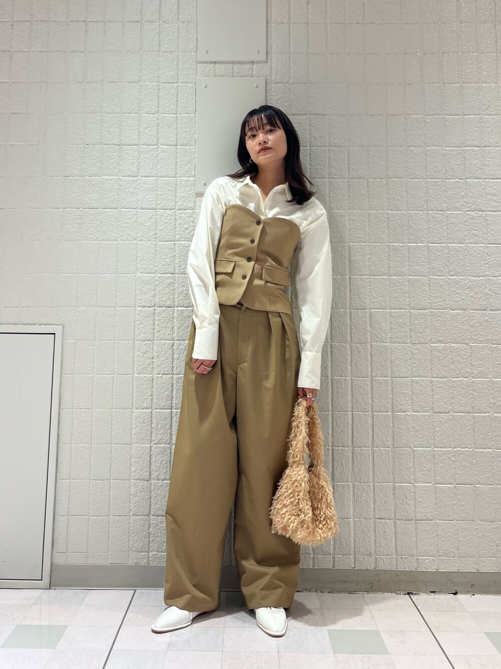 beigeカラーやキレイめコーデが好きな人におすすめしたいコーディネートです✨ このビスチェバストからウエストのラインが凄く綺麗なので、レイヤードのシャツをアウトスタイルでも可愛いですが、セットアップ風で着れそうなお色味の合うボトムがあれば、シャツをインしてセットアップ風で着るの可愛すぎるのでオススメです!!!🎶 もちろんシャツのアウトスタイルもどんなボトムとも合わせやすいので間違いないですよ🍀