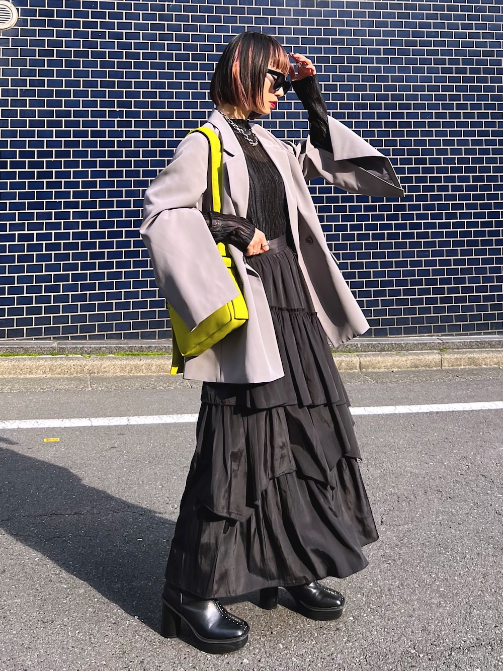 ついに、、、! 去年大バズり&即完だったマントジャケットが 新色春カラー『グレー』追加で再販開始🥺💕 きっと待ち望んでた方も多いのでは🥰?? このジャケット、袖のボタン閉めて そのままシンプルに着てもいいし ボタン開けてトレンドのマントスリーブにして着ても ほんっと可愛い🤤 今回はモードVer.🖤 お気に入りの #ひねち買い アイテム フリルティアードスカート合わせた モノトーンコーデ❤︎! インはとことんモードにブラックでまとめて 差し色にイエローもバッグ 持ってきたのがポイントです💛 Instagram▶︎【 @hinechi_pageboy 】 TikTok▶︎ 【 @hinechi_pageboy 】 STAFF BOARD▶︎【 Hinechi 】 毎日コーデ更新中! YouTube▶︎【 ひねちノート。 】 隔週金曜配信中!