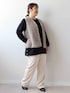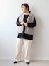【トップス】 〇【L~6L 大きいサイズ】エコファージレ グレー 重ねるだけで旬の着こなしになる、選べる2つの素材のエコファー&ボアのジレ。顔周りをシャープに見せてくれるVネックラインが、着こなしをすっきりと引き締めます。 【ボトムス】 〇【L~5L 大きいサイズ】ニットストレートパンツ クリーム 穿くだけで美脚見えする楽ちんストレッチのストレートパンツ。太もものラインを拾わず、裾までまっすぐに落ちるスッキリストレートシルエットが、気になる脚のラインをカバーしながら、長くきれいに見せてくれます。 【スタイリングポイント】 もこもことした素材感が愛らしいボアベストを主役にした、季節感あふれるスタイリング。ブラック×オフホワイトの落ち着いた配色でまとめることで、ベストの温かみのある表情を引き立てます。 足元はシャープなシューズを選ぶことで、カジュアルな中にきれいめな印象をプラスしました。