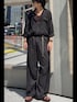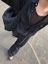 似た生地感のシャツとボトムスで組み合わせてジャンプスーツのようなコーディネートに インナーとサンダルはダークブラウンで統一して大人っぽくしてみました