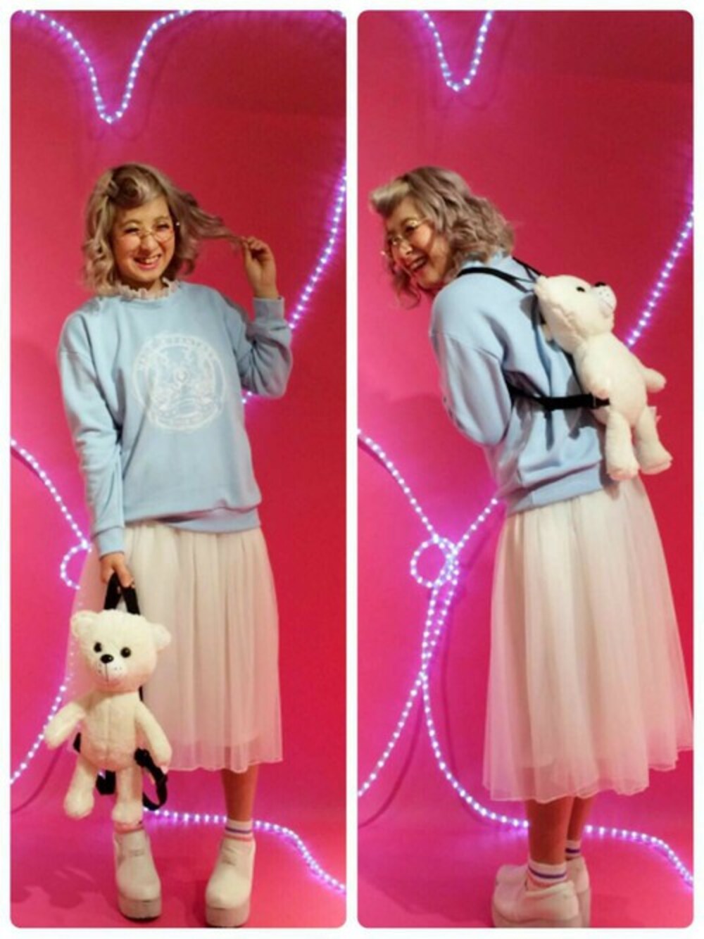LDS渋谷109店のましもです☆ ミディアム丈のチュールスカートにオーバーサイズのトップスでゆる~~くまとめたよ♪ くまさんのリュックが大のお気に入り♪ TOPS☆ 発売中 SKIRT☆ 11/発売予定 SHOSE☆ 発売中 BAG☆ 9/下 発売予定