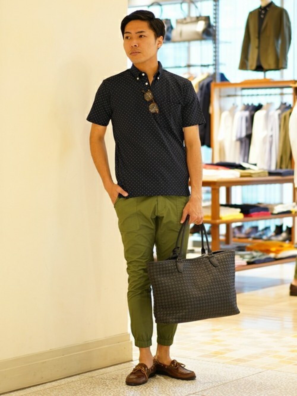こちらも初夏を感じさせるカジュアルスタイル。キレイになり過ぎない様にベイカーパンツとモカシンをチョイス。イントレチャートのトートバッグがグッとスタイリングを引き締めるポイントです。
