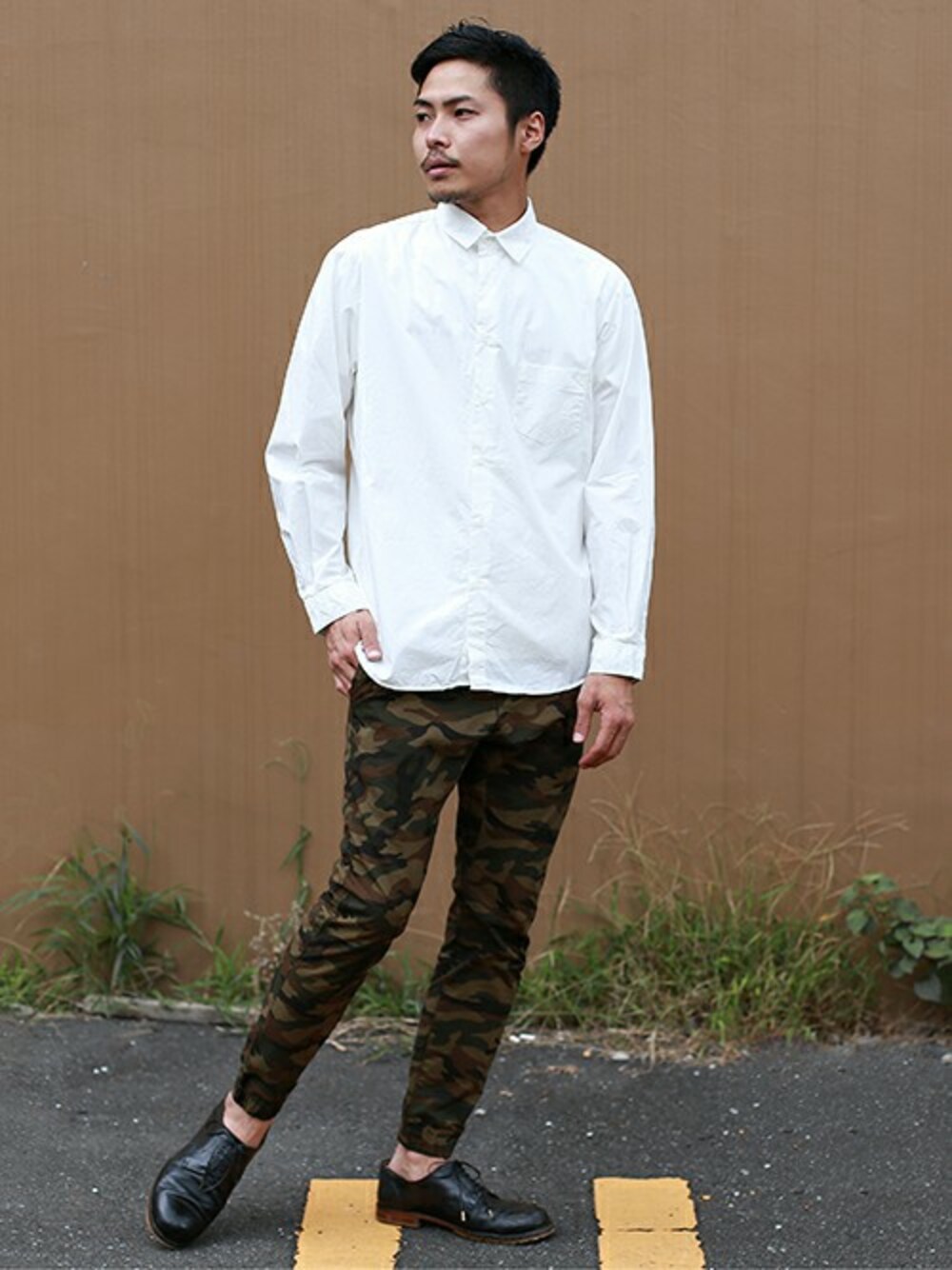 ホワイトのビッグシャツにカモフラのリブパンツをアクセントにしたスタイリング。迷彩が強くなり過ぎない様、ビッグシャツ、レザーシューズで程良く品のある仕上がりに。