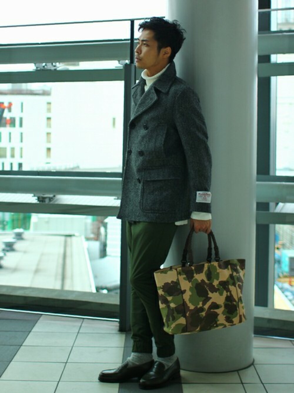 秋冬定番のハリスツイードのPコートにトレンドのグリーン・オリーブカラーを加えたコーディネート。ハリスツイードが持つクラシックな雰囲気に色味と柄を加え、タウンユースな仕上りに。