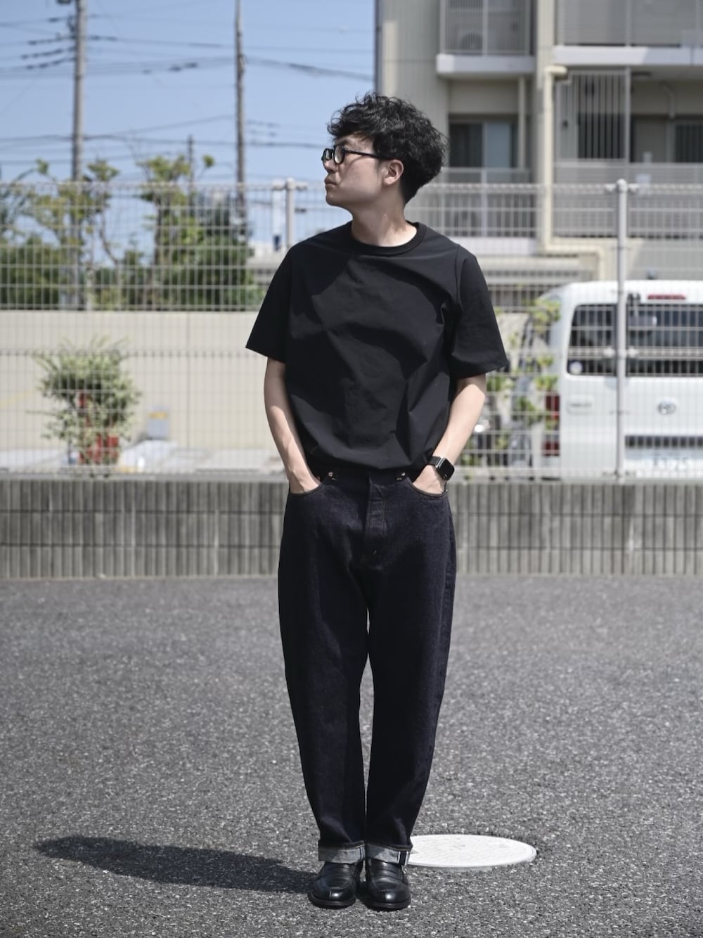 ブルー系のデニムパンツ、ブラック系のTシャツ/カットソーを着用したメンズの夏コーディネートの1枚目の写真