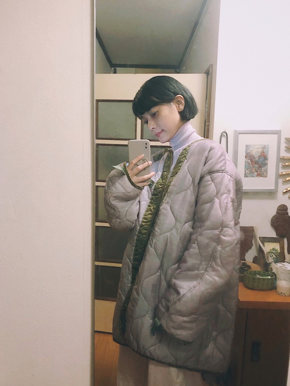 靴写ってないけど👟 薄紫さんコーデ🧕🏻🧠 Roseは下北の古着屋さん 脱色したライナーコート
