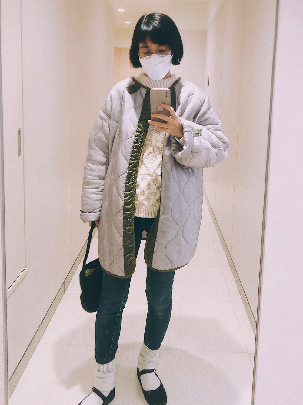 白ニットと古着のライナーコート でもこの日、もっとこのコーデに合う ミリタリーコートを買ってしまった🧸🎄 Roseは下北の古着屋さん Instagram @rose_shimokitagawa