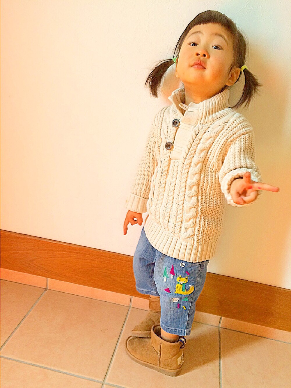 ホワイト系のニット/セーターを着用したキッズの冬コーディネートの1枚目の写真