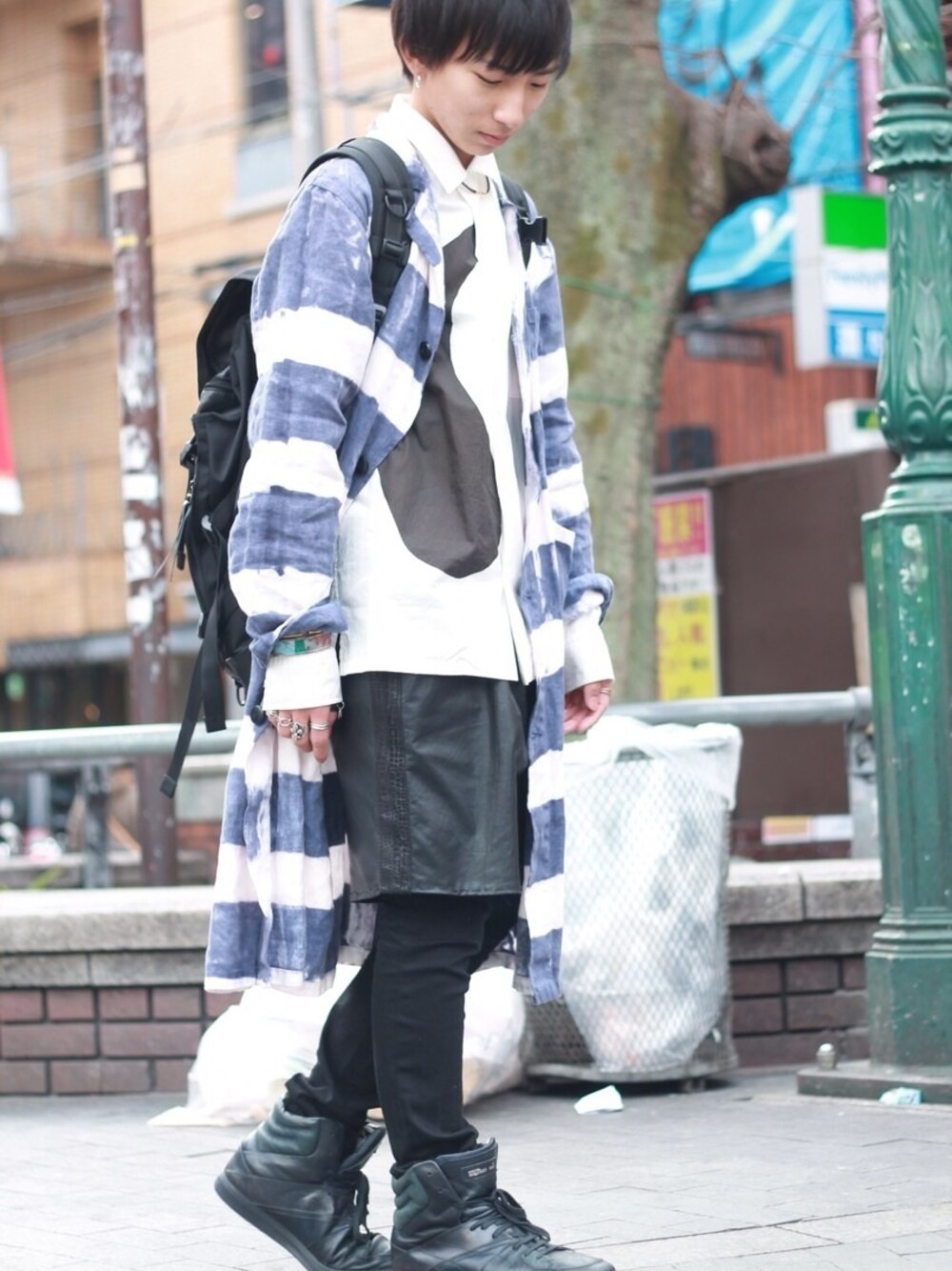 ボーダーコート:11747391 シャツ:Y's ショーツ:リメイク スニーカー:アレキサンダーマクウィーン
