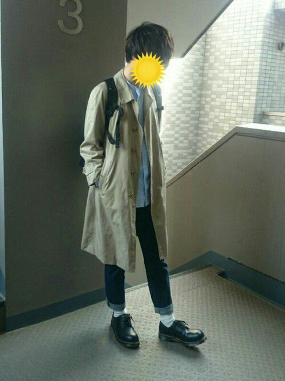 ステンカラーコートとマーチンにストライプのノーカラーシャツ、デニム、ソックスでカッチリし過ぎないようなコーデにしました。 今日の写真はリュック背負ってますが基本的に毎日リュックです。