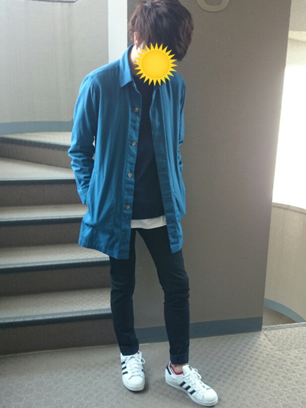 ブルーのステンカラーコートにネイビーのニットとロング丈Tシャツのレイヤード。 色のまとまり○笑 だがしかし暑かった。。