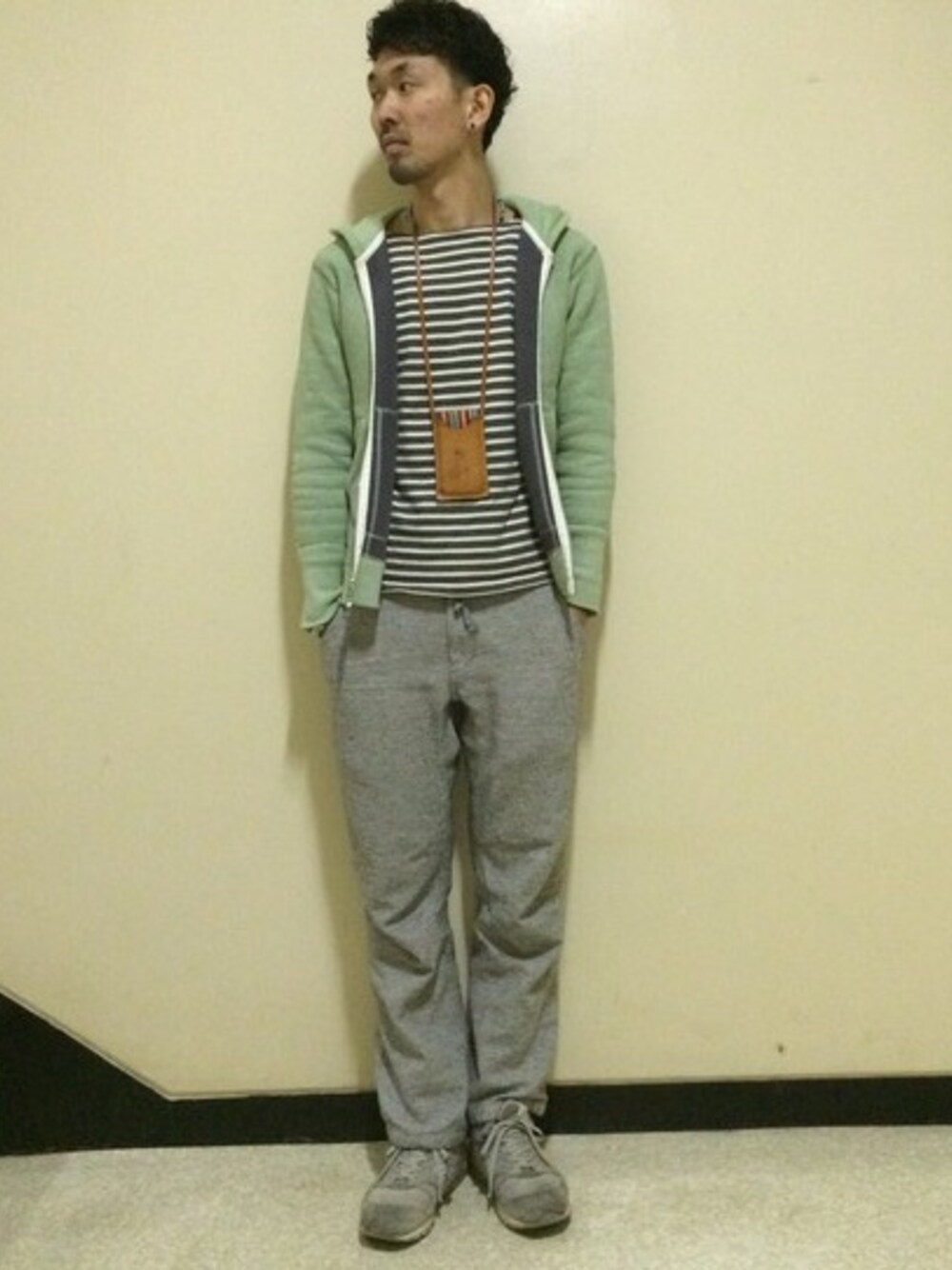 今宵は、 グレーで統一したワンマイルウェア にグリーンで差し色を投入 スポーティな装い 部屋を飛び出して公園でも行こう