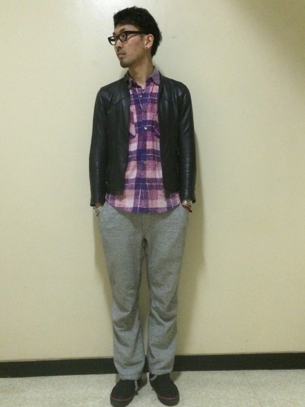 今宵は、ルードなカジュアルと題して レザージャケットでルード感 インナー ボトムスでカジュアル感 プラス 色味は寒色系でまとてめ 出来上がり 参考までにどうぞ