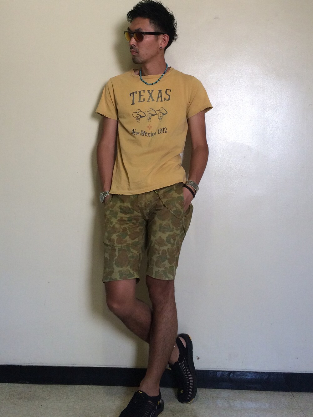 今宵は、カモフラージュアウトドア ハンターカモと相性の良い マスタードカラーのプリントTに アウトドアなスポーツサンダルを合わせる