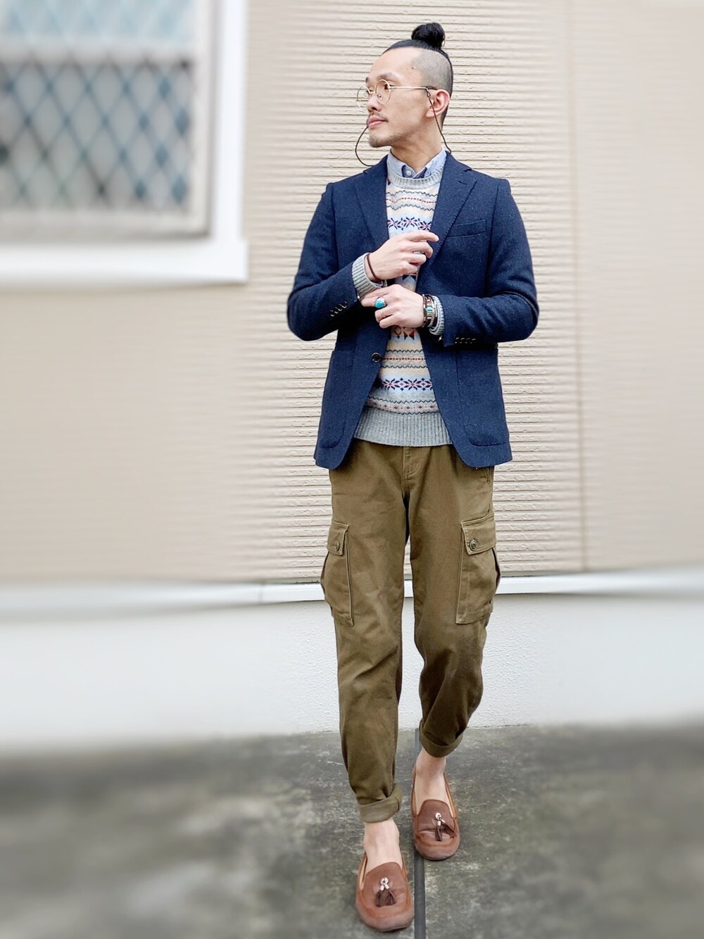 皆様おはようございます、僕です 気温も上がってすっかり春めいてきましたが今回のコーデはこちらです、ドン 「流石にそろそろ暑いので着納め」そんなコーデです 薄手のニットにジャケットのレイヤード、ちなみにどっちもウール、そりゃあ暑い ガチッとし過ぎないようにボトムスは細身のカーゴパンツをロールアップして革靴、アクセも多めに付けてます ではでは