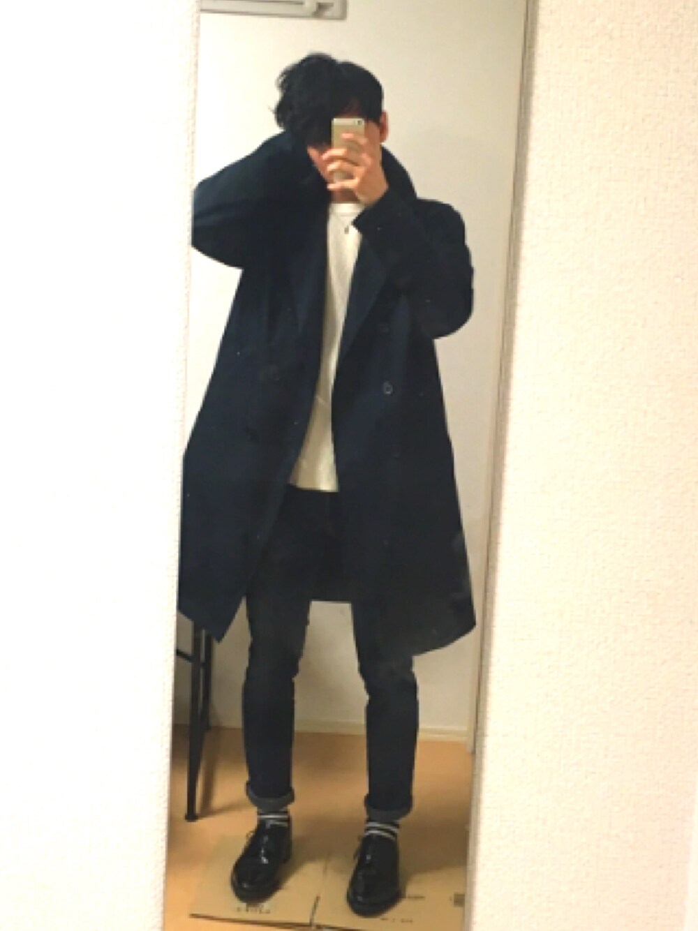 見にくいけど、トレンチコートを色落ちデニムで。