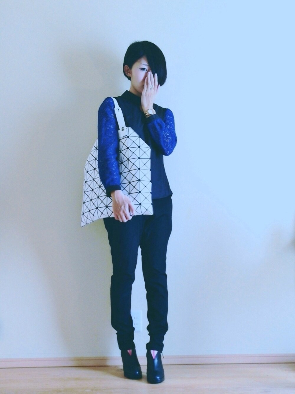 手の血管が…こわい イッセイミヤケのバッグはほんと色んな 洋服に合うし、最近はこればかり使ってます