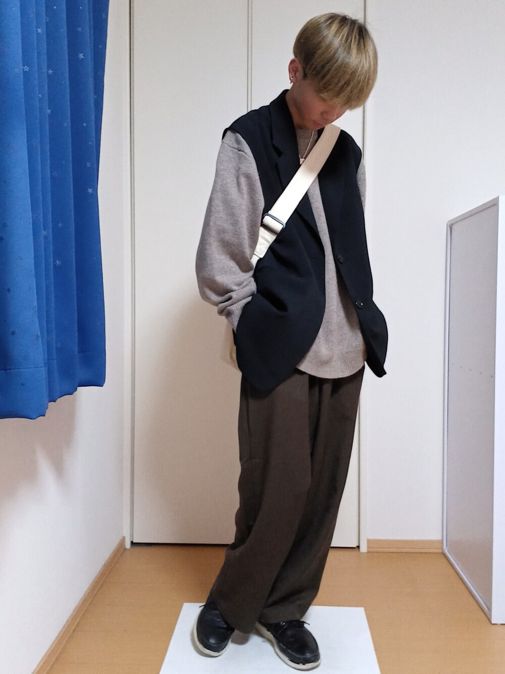 ニットにジレを合わせたコーデ! 結構キレイめよりになってるが、ベージュやブラウンなど色を使ってるからカジュアル要素がある。どっちかと季節は秋より?…w