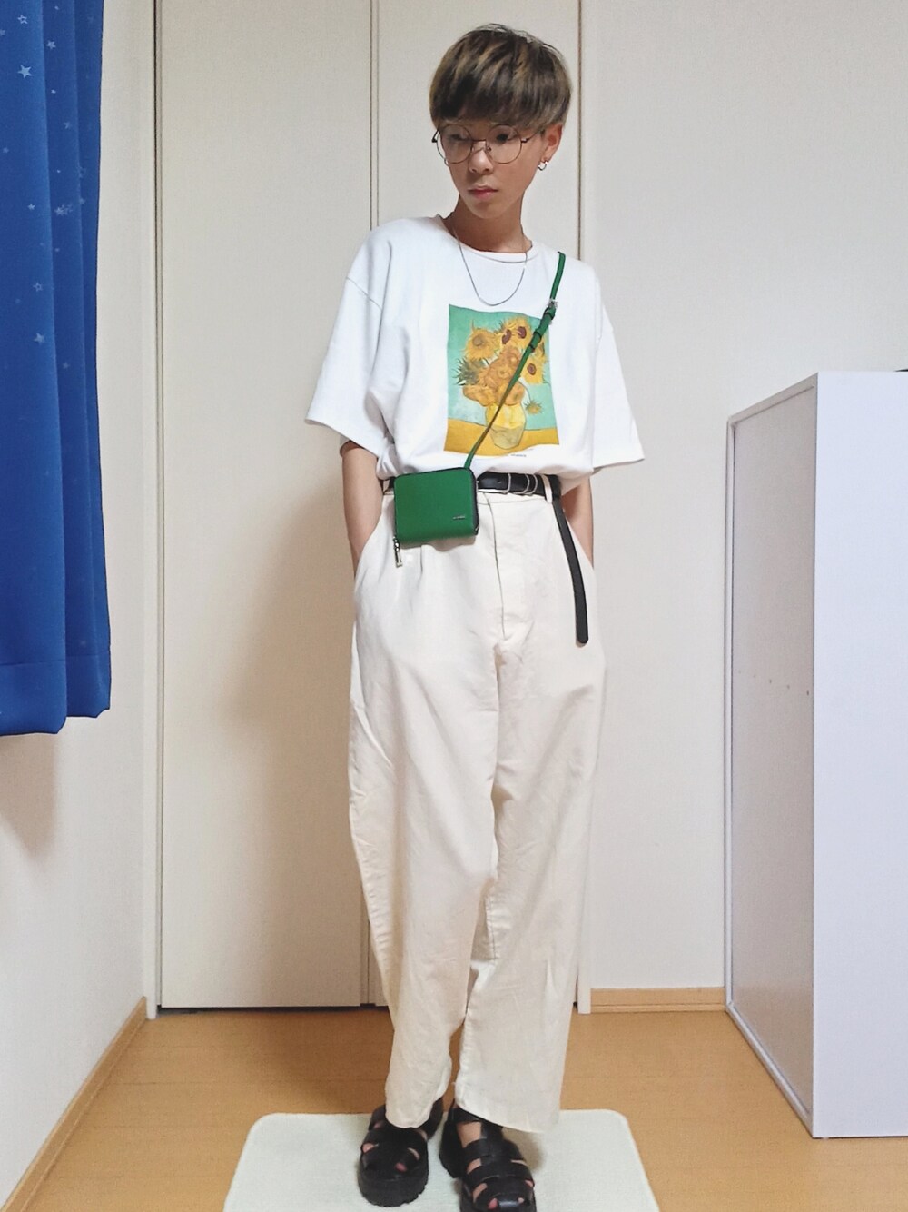 オールホワイトコーデ! 全体的にカジュアルな要素をすることによってオールホワイトというキレイめを和らげてくれる!ベルトとサンダルでサンドウィッチ効果をし、さらにはグリーンの財布をかけることによって、差し色にもなりトレンド感もある!所々前の投稿反転されてるw(これは鏡じゃない)