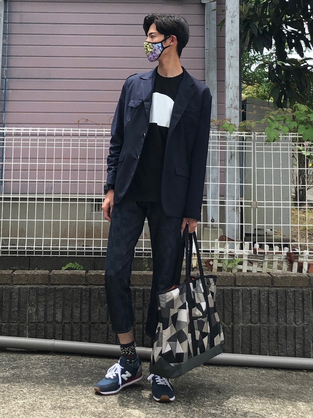 自分の絵画作品をプリントしたマスクとANREALAGEを合わせてみました。 足下はジュンヤとニューバランスのコラボスニーカーで外しました。