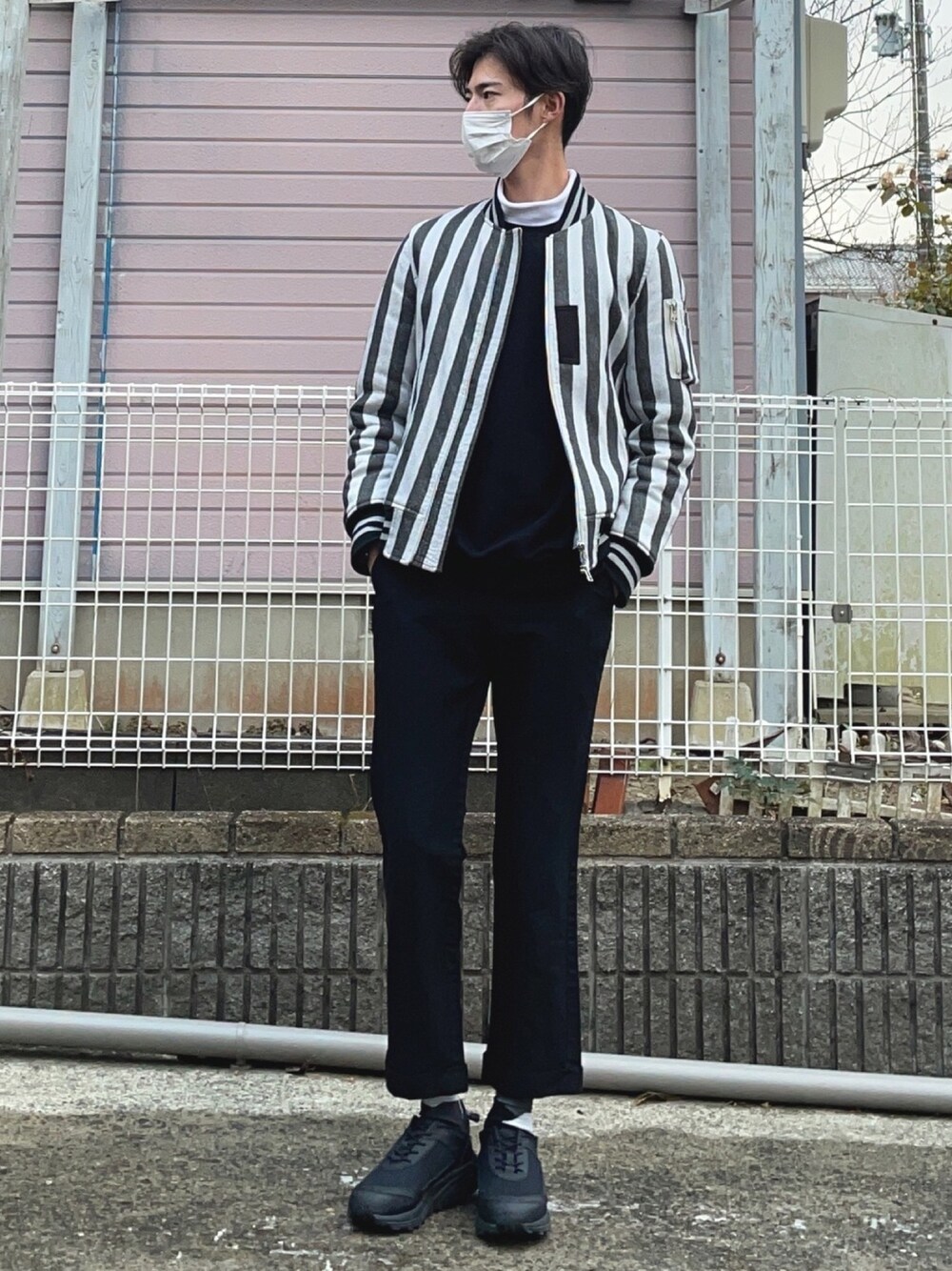 直線柄を意識したモノトーンコーデ。 MA1の量感と細身のパンツ、量感のあるスニーカーで凸凹にすることでスタイリッシュに。