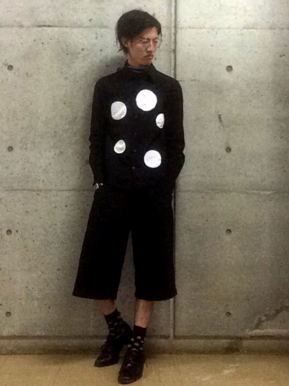 オールブラックコーデです^ ^ ドットを中心に黒でまとめました^ ^ ドットの白が黒の中で主張し存在感を発揮するということポイントにしました! ANREALAGEのシャツはドットの柄だけでなく大きさや配置がまた絶妙で一目惚れしました^ ^ ANREALAGEの前のLIGHTの時のシャツです^ ^ パンツ以下はUSEDでまとめました^ ^ このワイドスラックス風のパンツはなんと700円!!笑 古着屋で見つけた掘り出し物です!笑