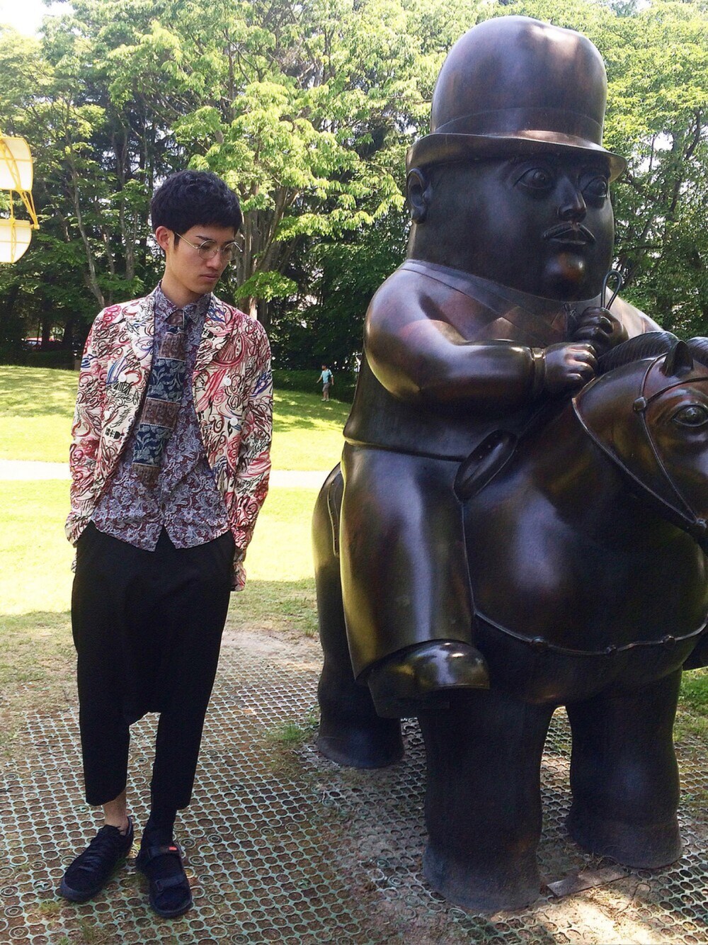 フェルナンド・ボテロの『馬に乗る男』と隣に立つ男。笑 宮城県美術館にいってアンギアーレの戦いのダヴォラ・ドーリアの戦いを見て来ました^ ^ そして今日のコーデは柄×柄コーデです^ ^ 強烈な柄をあえて生み出し、楽しみました笑