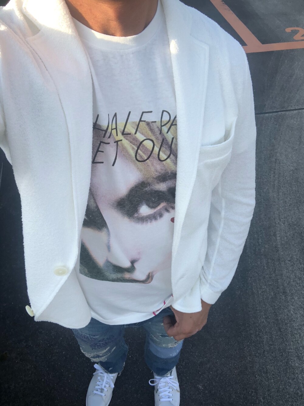 いつも見ていただきありがとうございます😊 今日もヒスのTシャツとリメイクデニムにアローズの白ジャケでやんちゃな大人コーデ🙄 いつもいいねお気に入りフォローくださる皆様ありがとうございます😊 明日はこれの顔出しでお届けします🤣←誰も待ってないか(笑)